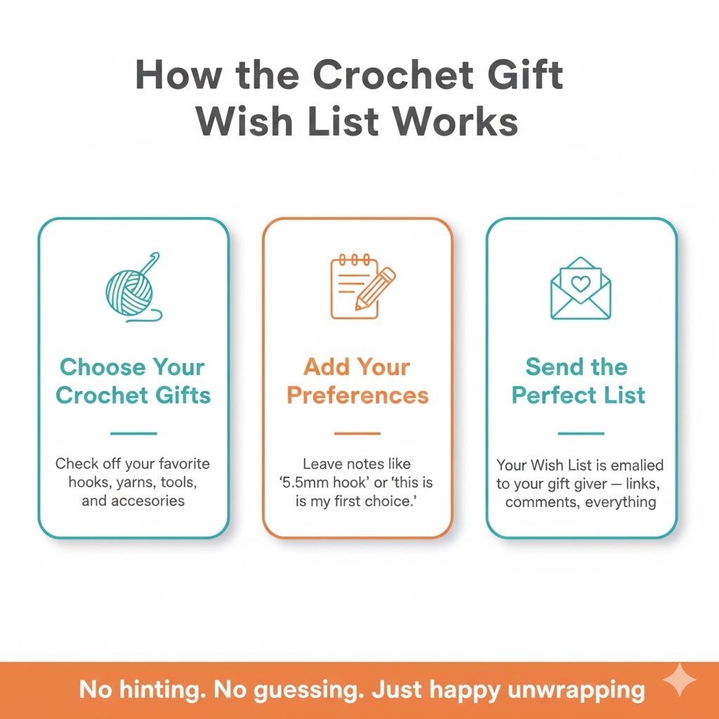 Let’s fix that. Make your Crochet Gift “Wish List,” choose the tools, hooks, yarns, and accessories you truly want, add a few notes (“5.5mm hook,” “prefer wool blends,” “this is my first choice”), and we’ll send a perfect list straight to your gift giver.